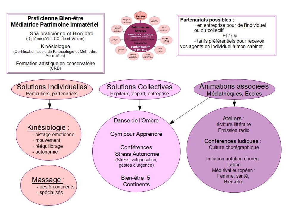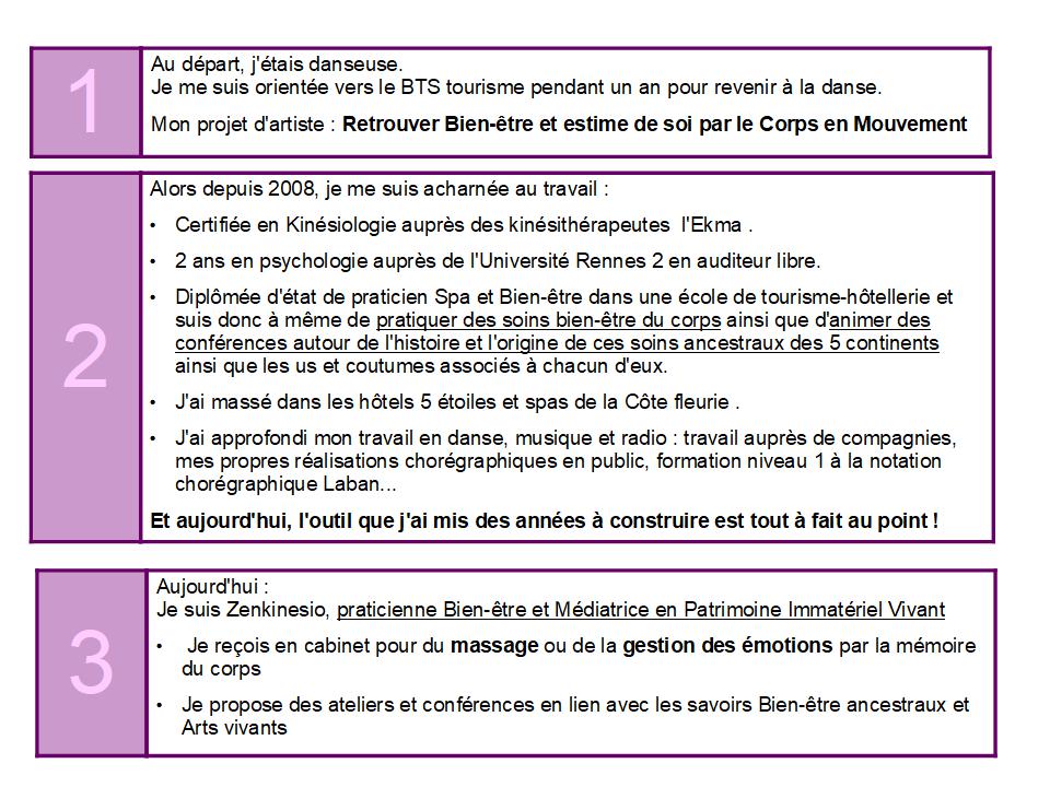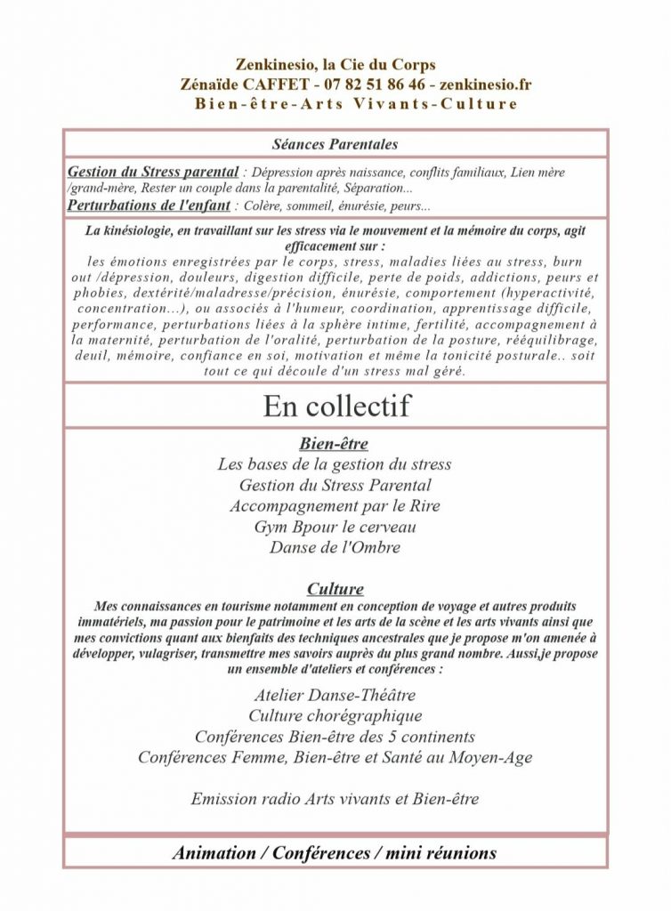 Spécialisée dans le bien-être depuis 2008, la qualité des consultations est le résultat de formations spécifiques : une certification en Kinésiologie au bout d’un an de formation, une certification en Réflexes archaïques, un diplôme d’état de praticien Spa et bien-être également après un an de formation, deux années de Psychologie en cours du soir, quelques formations ponctuelles en Hypnose, Magnétisme, Ennéagramme et Hoo’ponopono me conférant une approche culturelle très riche donc une excellente capacité d’adaptation à la personne. C’est aussi le fruit de collaborations, notamment avec des sportifs ou des psychologues, la pratique régulière de la danse classique, moderne ou contemporaine depuis mes 5 ans qui développe tant les ressources émotionnelles que corporelles ou cognitives d’où s’ensuit une formation de 6 mois en notation chorégraphique – kinétography Laban où je puise beaucoup d’exercices très efficace à la gestion des stress et des apprentissages. Excellent support pour la normalisation des comportements, Zenkinesio est également le fruit de recherches personnelles et de périodes de créations pendant lesquelles je mets au point des protocoles inédits. C’est aussi le résultat d’un engagement actif dans le milieu artistique et culturel : création d’ateliers, diffusion radiophonique, vidéos explicatives pour enfants…